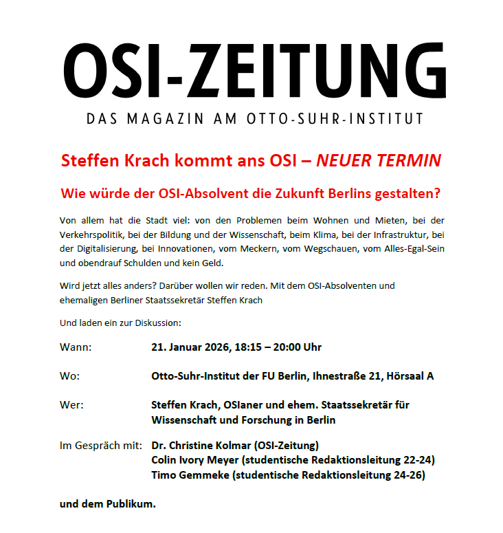 Die OSI-Zeitung trägt die Arbeit des Otto-Suhr-Instituts nach außen und holt aktuelle Debatten an den Campus.