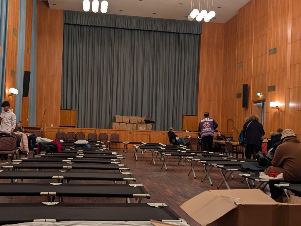 12:00: In der Anlaufstelle Onkel-Tom-Straße kann ich duschen und es gibt Essen, Kerzen – und Journalist:innen.