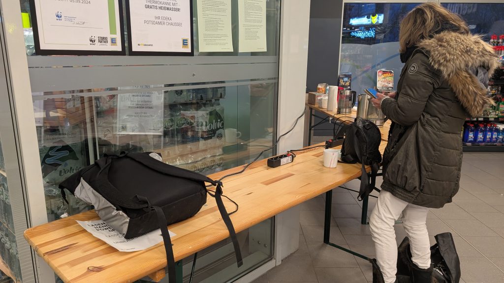 07:10: Edeka ist wieder offen und bietet Steckdosen und heißes Wasser an.