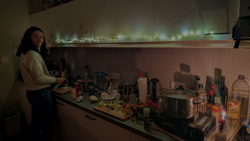 20:38: Wir gehen zu Edeka und holen heißes Wasser. Mit einem ausgeliehenen Gasherd versuchen wir, Suppe zu kochen.